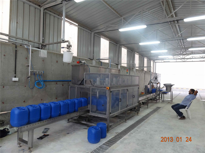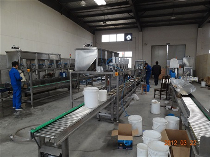 手工放桶—自動輸送—6頭自動定位稱重灌裝—自動理蓋—自動旋蓋—重量檢測—自動貼標(biāo)—自動噴碼—輸送到碼垛位—半自動碼垛—托盤輸送—叉車運(yùn)走